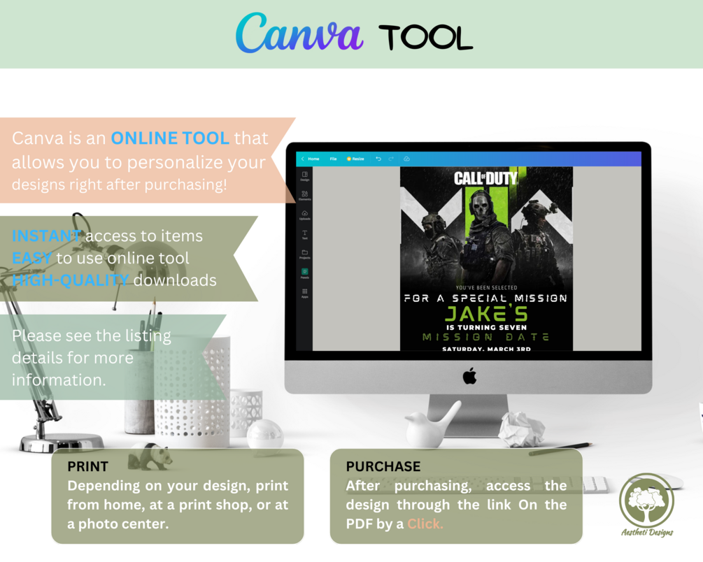 This listing is for a printable birthday party invitation that you can personalize and download through canva.com. It will not be personalized or printed through Aesthetic Printable Designs. You will need access to a computer (recommended) or phone (for basic edits) and a printer, so you can personalize and print your file.